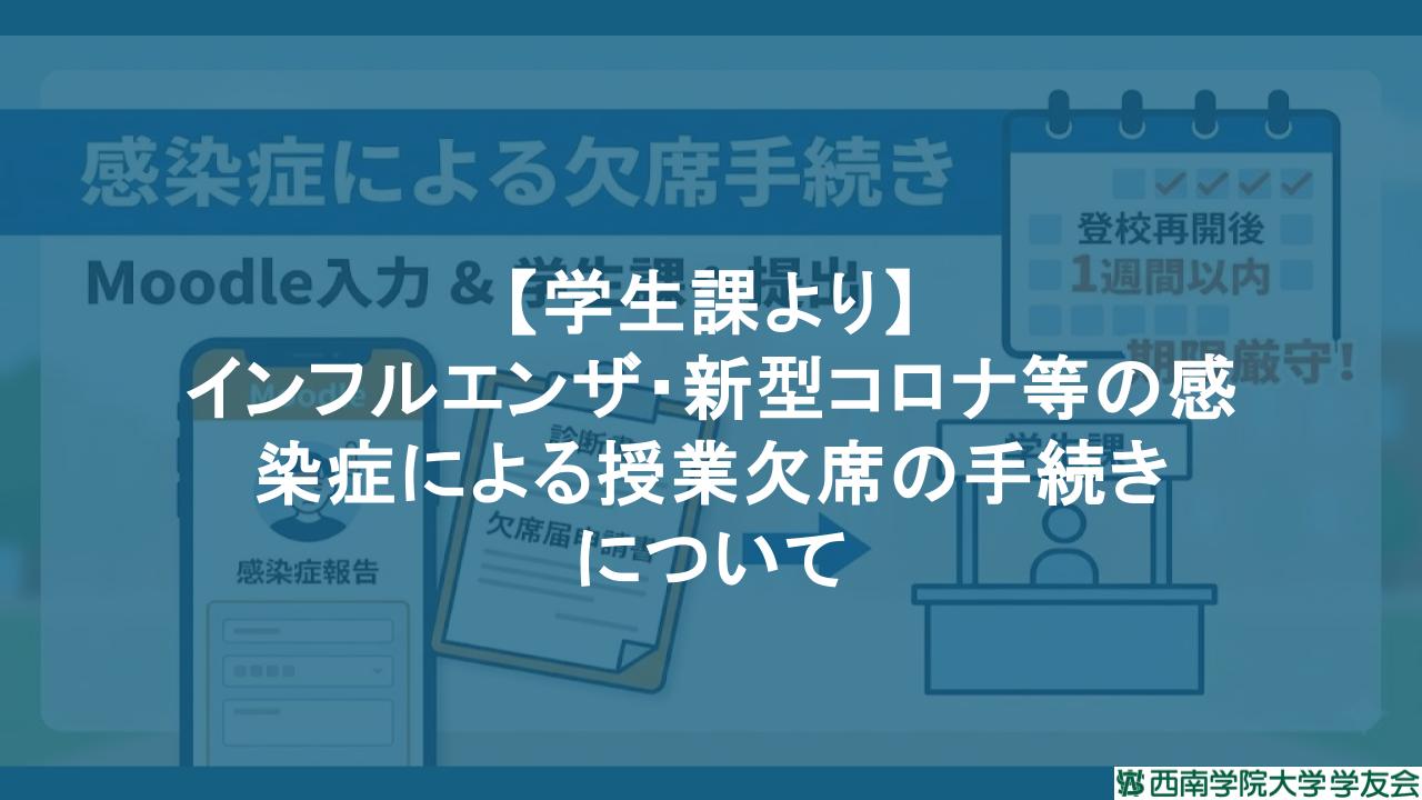 インフルエンザや新型コロナウイルス感染症など、学校保健安全法に定められた感染症に罹患した場合、所定の手続きを行うことで出席停止(公欠)の扱いとなります。 手続きにはMoodleへの入力や学生課への書類提出が必要です。以下の手順をよく確認し、漏れのないように対応してください。