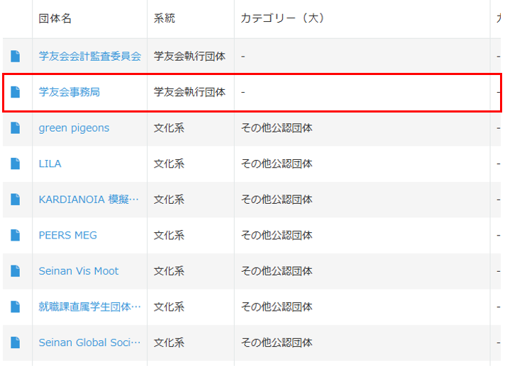 一覧画面で自分の団体名を確認し、状況に合わせて以下の操作を行ってください。
